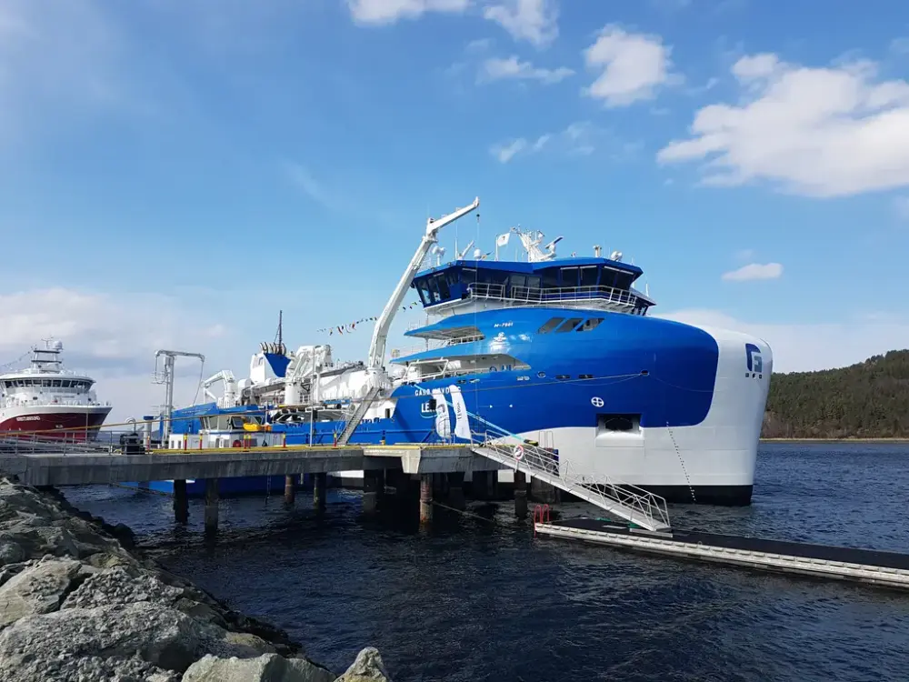 Flakstad fiskeoppdrett, 1974 : Brønnbåten "Petra" ligger ved en merde av typen "Grøntvedtmerde". Bildet er del av MISTs fotosamling. Fotograf: Christian Andersen